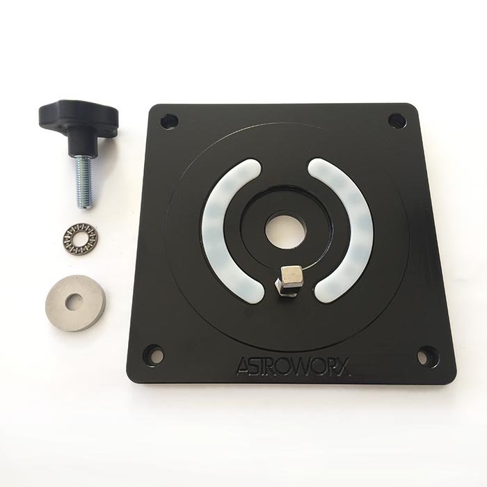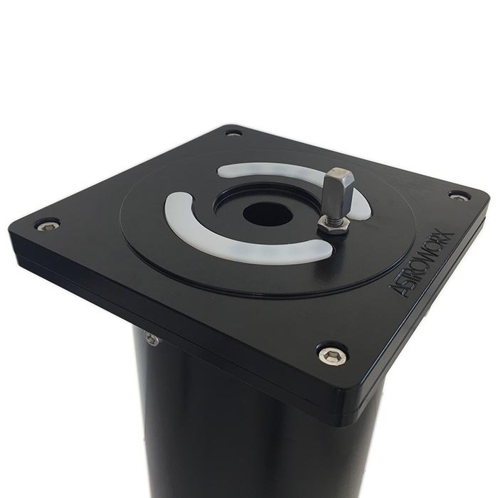 The Astroworx EQ6 Pier Adapter Plate features Delrin Plastic anti-friction mount supports and provides four recessed mounting holes (180mm x 180mm square pattern) to mount the plate. The pier adapter plate also includes four mounting bolts, an Azimuth Adjustment Post and a M12 Centre Bolt with Fluted Plastic Knob and Flat Bearing.